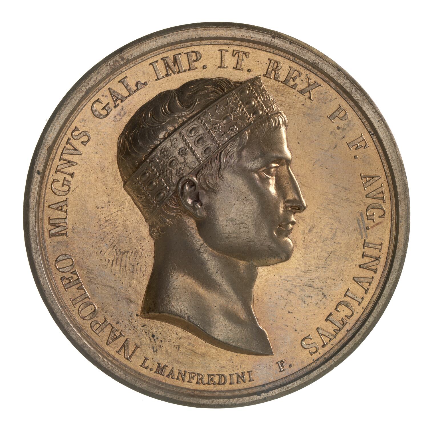 Head of Napoleon facing right wearing the Iron Crown of Italy; around, NAPOLEO MAGNVS GAL. IMP. IT. REX P.F. AVG. INVICTVS; below in small lettering, L. MANFREDINI F.