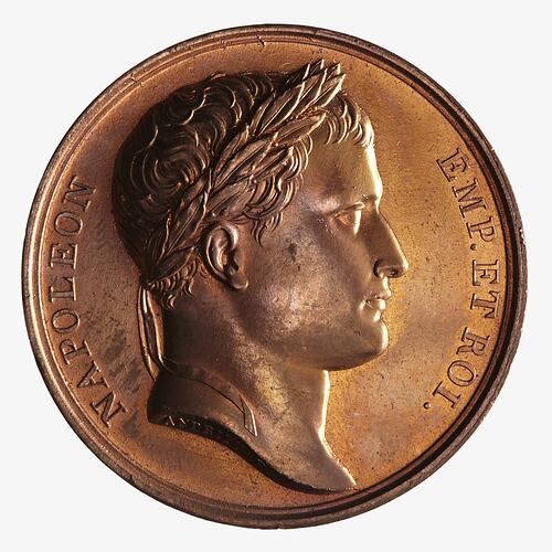 Laureate head facing right; around, NAPOLEON EMP. ET ROI.; on neck truncation, ANDRIEU F.