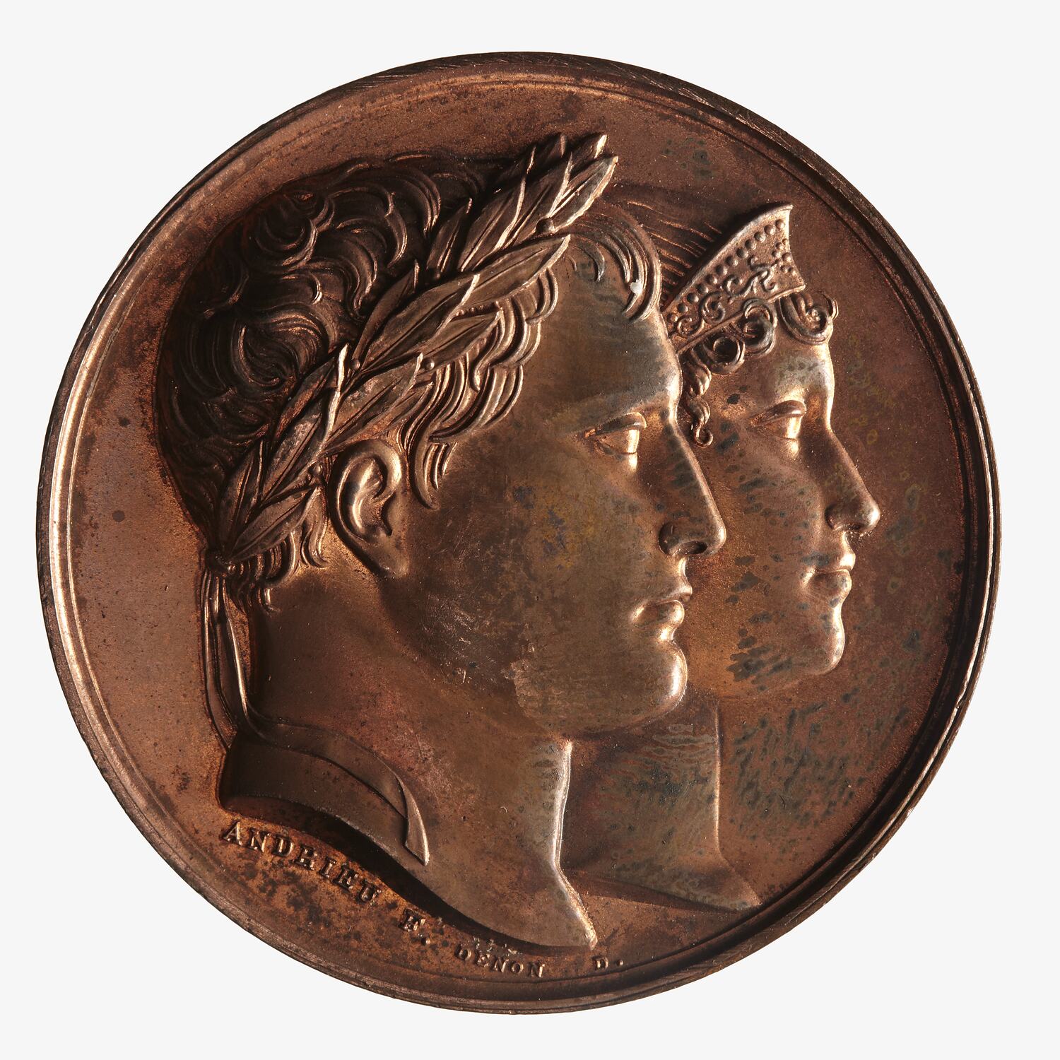 Conjoined heads of Napoleon, laureate, and Maria Louisa, diademed, facing right; below, ANDRIEU F. DENON D.