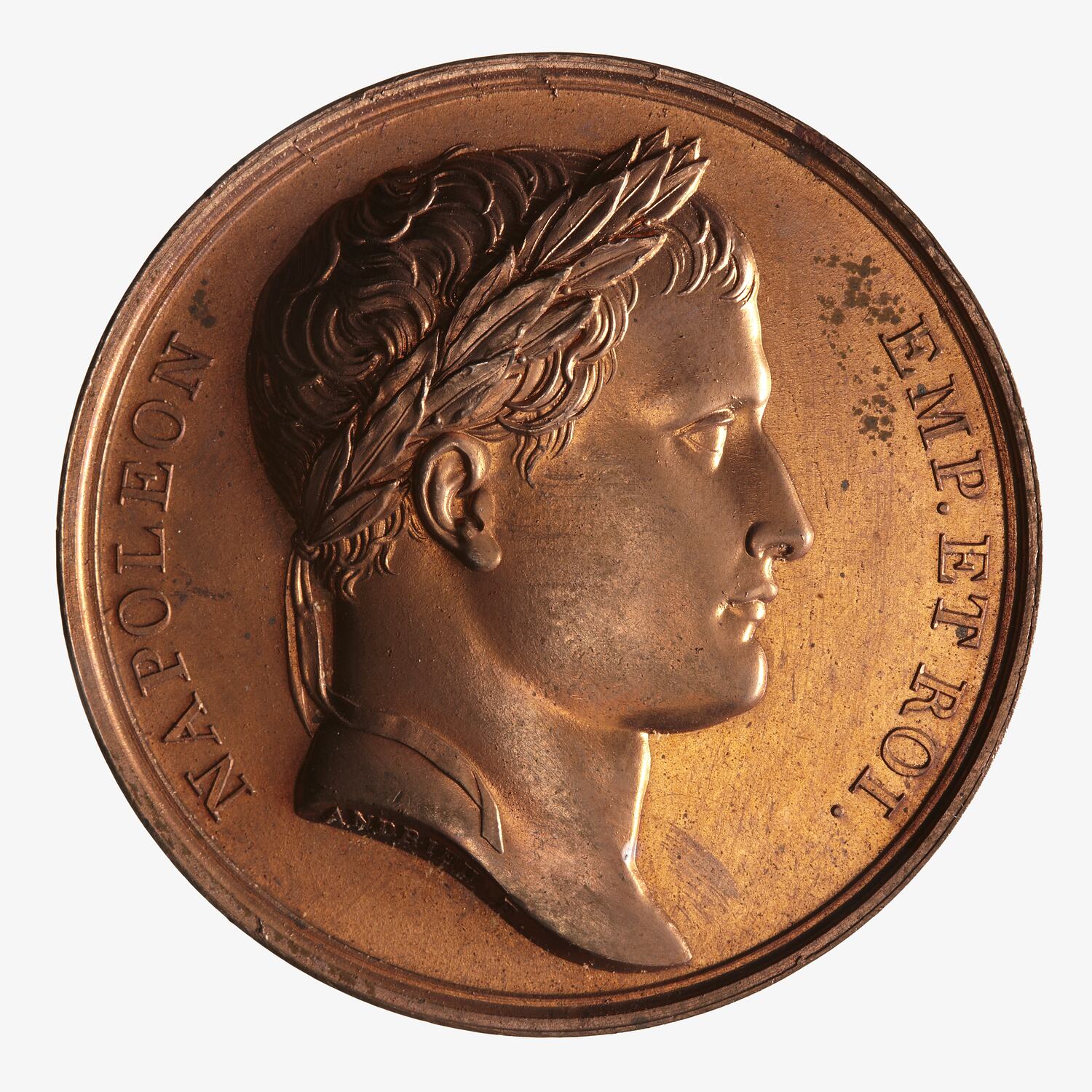 Laureate head facing right; around, NAPOLEON EMP. ET ROI.; on neck truncation, ANDRIEU F.