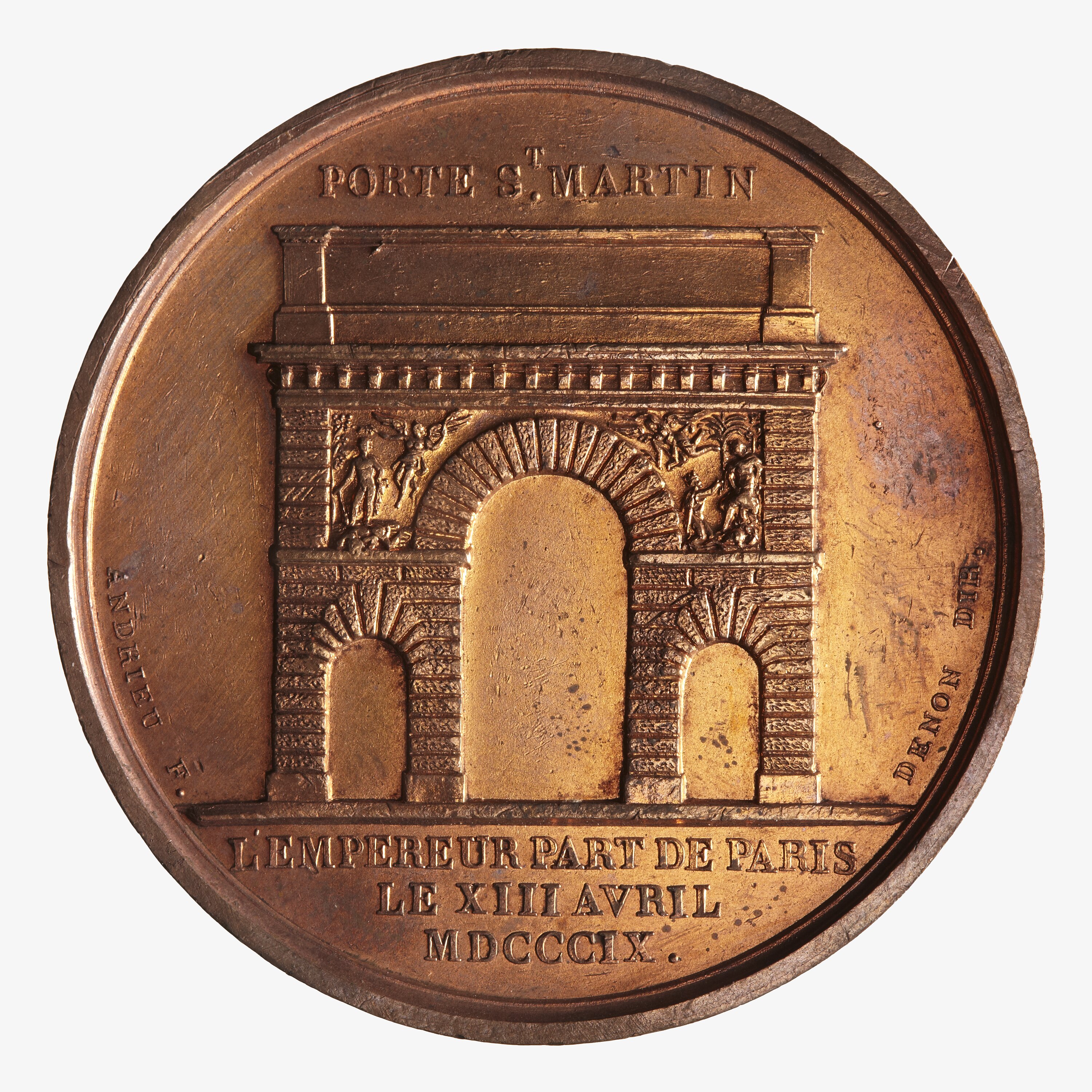 Gate of Saint Martin at Paris; above, PORTE ST. MARTIN; at sides near rim in small lettering, ANDRIEU F. DENON DIR.; in exergue, L'EMPEREUR PART DE PARIS / LE XIII AVRIL / MDCCCIX.
