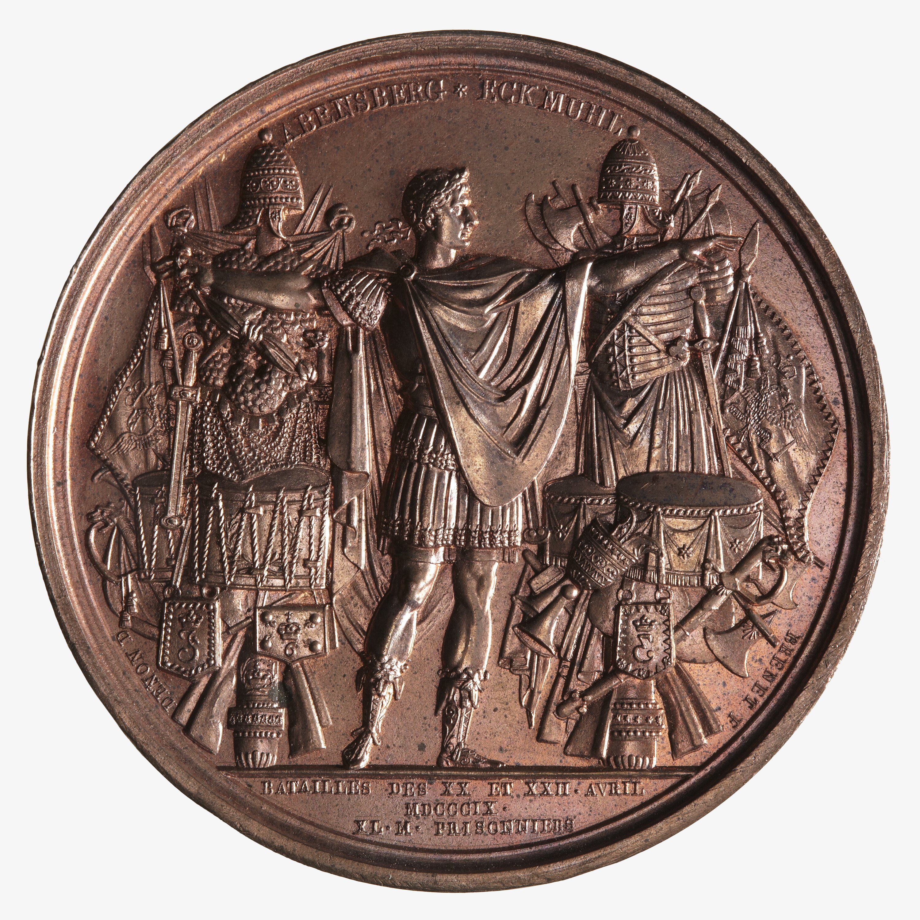 Napoleon head laureate standing full length in Roman armour, his arms stretched out pointing towards military trophies at left and right; above, . ABENSBERG * ECKMUHL.; in small leterring near rim at base of trophies, DENON D. BRENET F. in exergue, BATAILLES DES XX. ET XXII. AVRIL / MDCCCIX. / XL.M. PRISONNIERS.