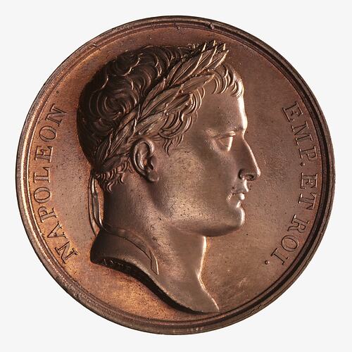 Laureate head facing right; around, NAPOLEON EMP. ET ROI.; on neck truncation, ANDRIEU F.