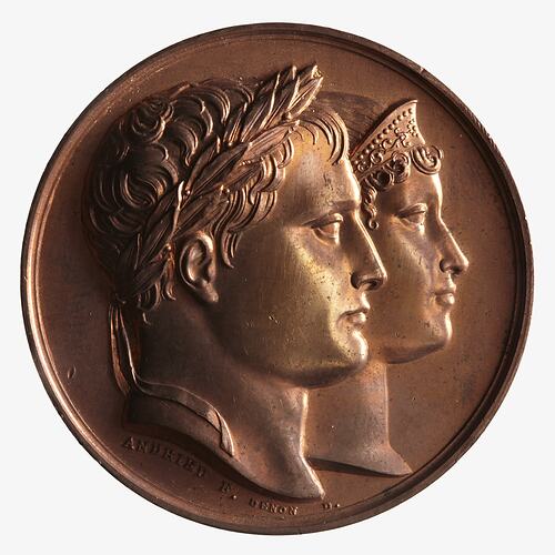 Profile busts of the Emperor Napoleon, laureate, and the Empress Maria Louisa, diademed; below in small lettering, the name of the artist and designer, ANDRIEU F. DENON D.
