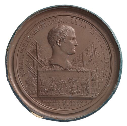 Within a rectangular frame surrounded by trophies and flags, the battle scene; above, head of Napoleon facing right; around, BONAPARTE PREMIER CONSUL DE LA REPUBLIQUE FRAN.; in exergue, BATILLE DE MARINGO / LE XXV PRAIRIAL / AN.VIII.; on exergue line in small letters, ANDRIEU.F. AN.X.