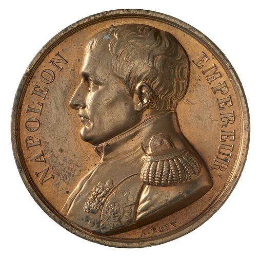 Bust of Napoleon facing left, wearing a military uniform with decorations; Around: NAPOLEON EMPEREUR; below: A. BOVY