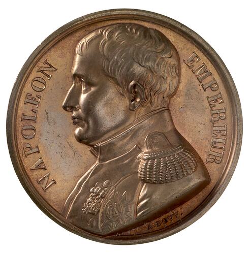 Uniformed bust facing left; around, NAPOLEON EMPEREUR; below in small lettering, A. BOVY.
