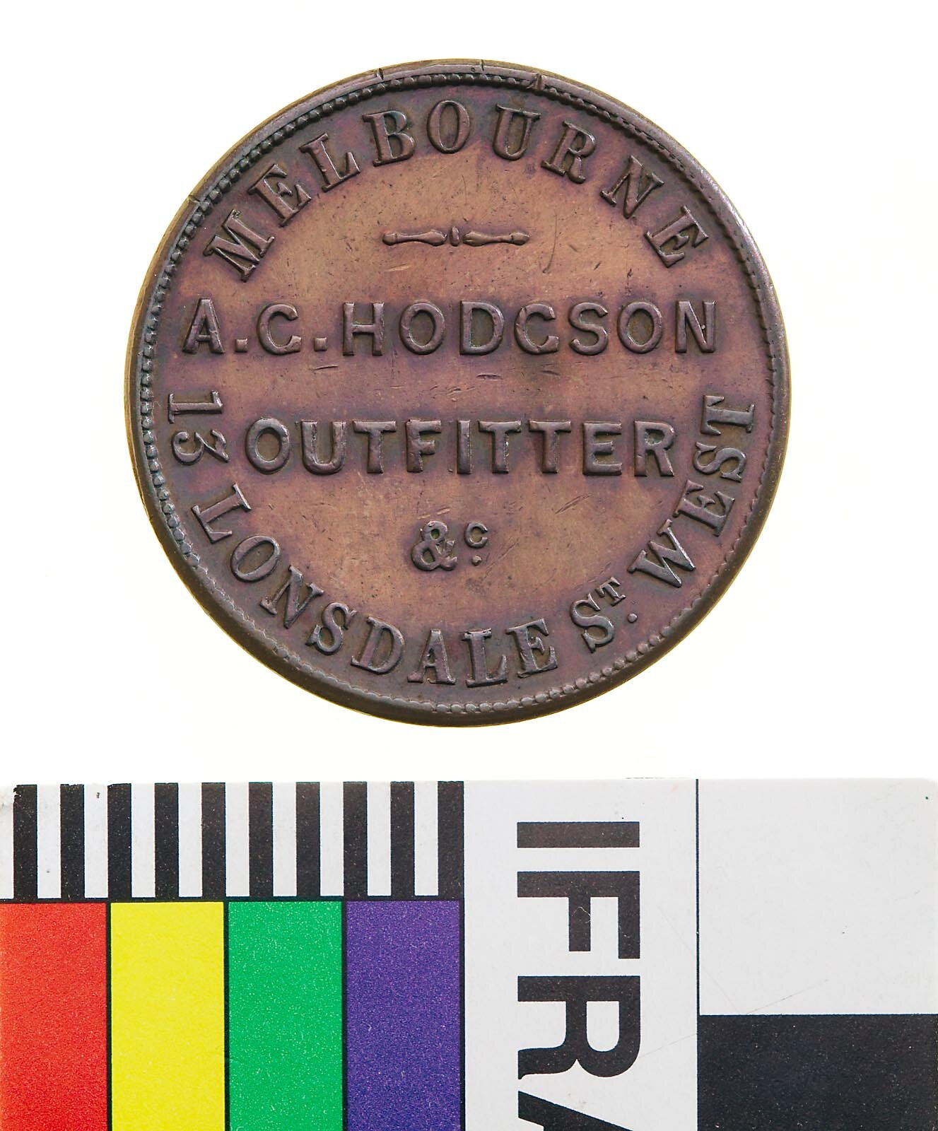 Inscription in 5 lines, the first and last curved; MELBOURNE / ._. / A.G.HODGSON / OUTFITTER / &c. / 13 LONSDALE ST. WEST
