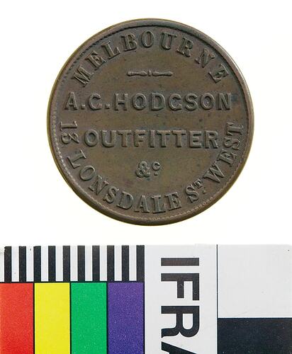 Obverse: MELBOURNE A.G.HODGSON OUTFITTER &c. 13 LONSDALE ST. WEST Reverse: VICTORIA 1862 COARD LONDON