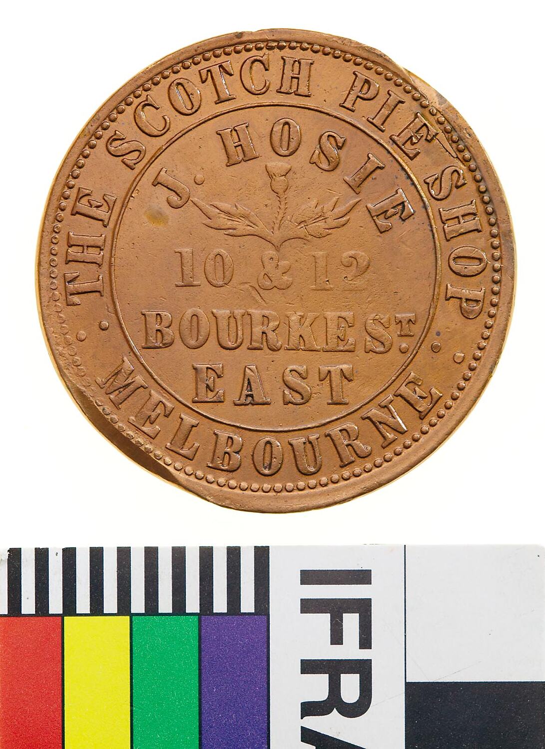 Obverse: J. HOSIE 10 & 12 BOURKE ST. EAST THE SCOTCH PIE SHOP MELBOURNE Reverse: VICTORIA 1862 ADVANCE AUSTRALIA T. STOKES MAKER 100 COLLINS STREET EAST MELBOURNE