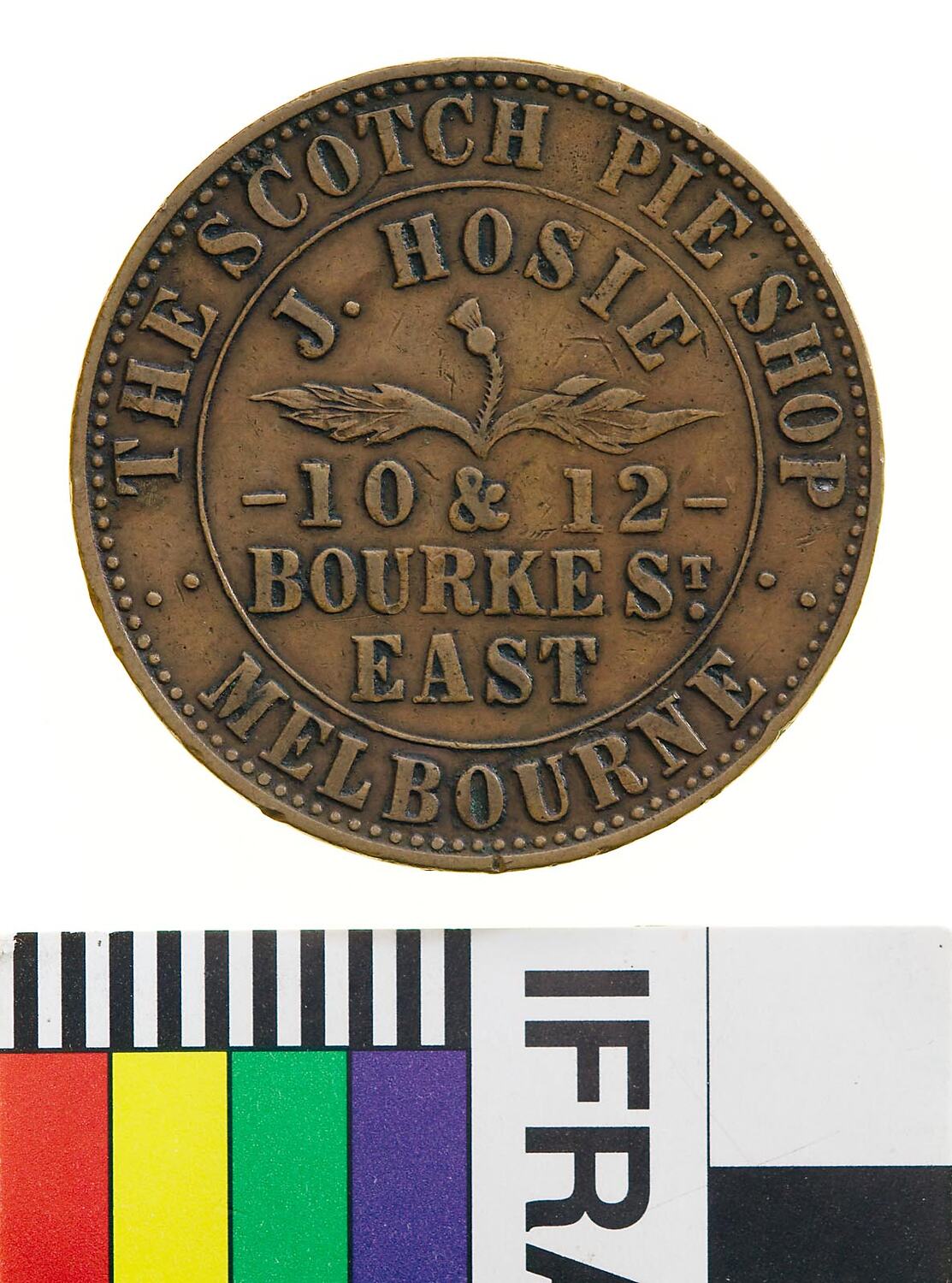Obverse: J. HOSIE 10 & 12 BOURKE ST. EAST THE SCOTCH PIE SHOP MELBOURNE Reverse: VICTORIA 1862 IN VINO VERITAS T. STOKES MAKER MEL.