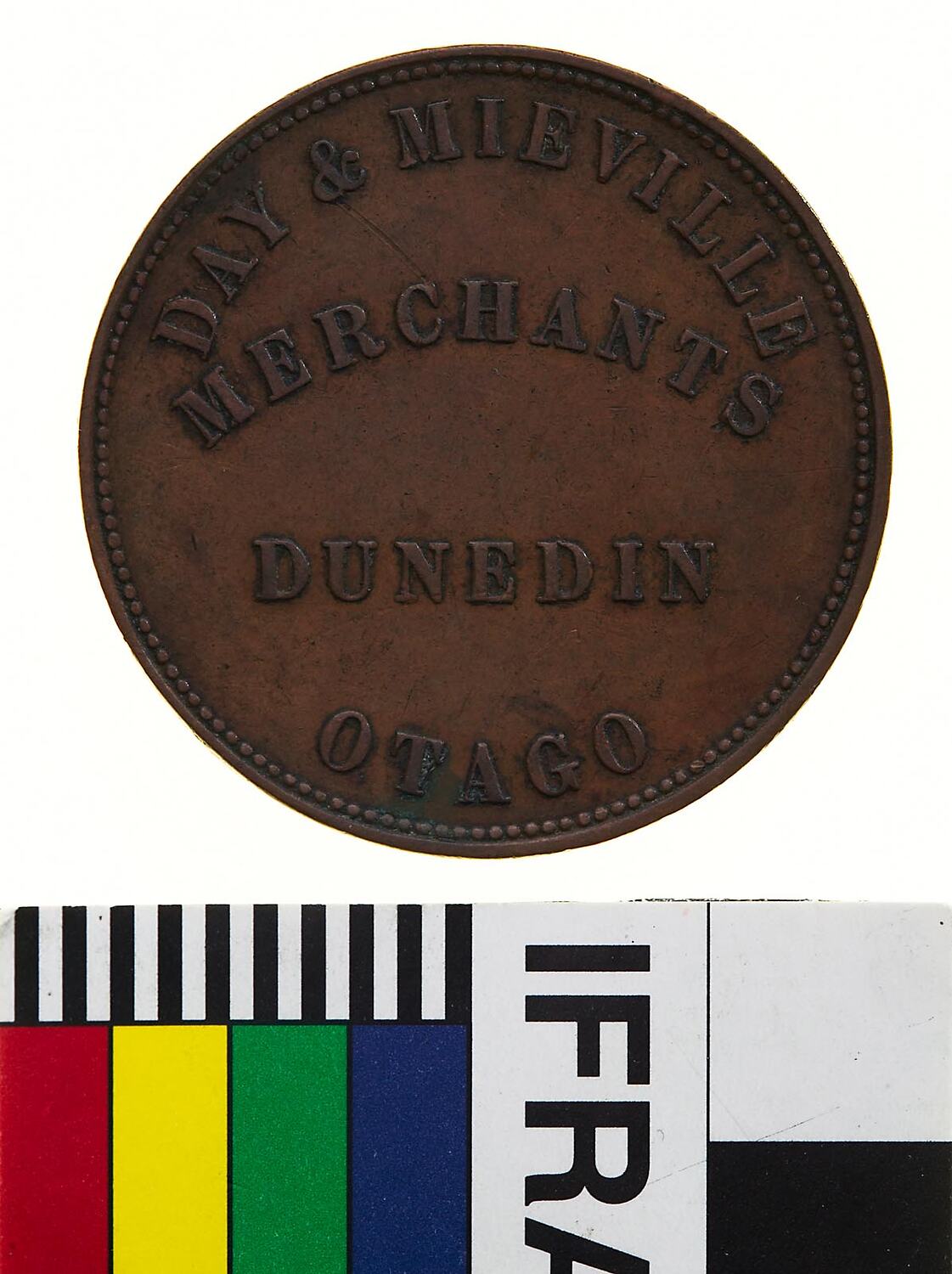 Obverse: DAY & MIEVILLE MERCHANTS DUNEDIN OTAGO Reverse: NEW ZEALAND 1857