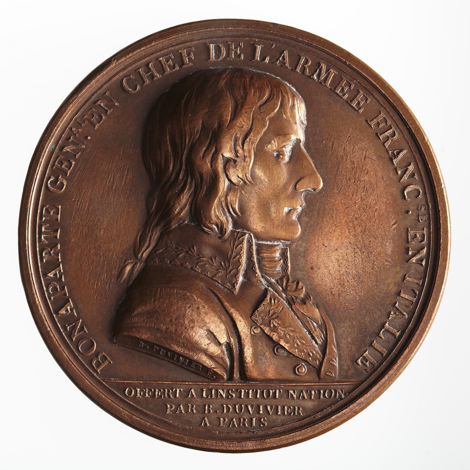 Draped bust of Napoleon facing right; around above, BONAPARTE GENAL. EN CHEF DE L'ARMEE FRANCSE. EN:ITALIE (translation: Bonaparte, General in Chief of the French Army in Italy); in exergue in three lines: OFFERT A L'INSTITUT NATION. / PAR B. DUVIVIER / A PARIS (translation: Presented to the National Institution by B. Duvivier, Paris); on bust truncation, B. DUVIVIER F. (the second 'V' double entered)