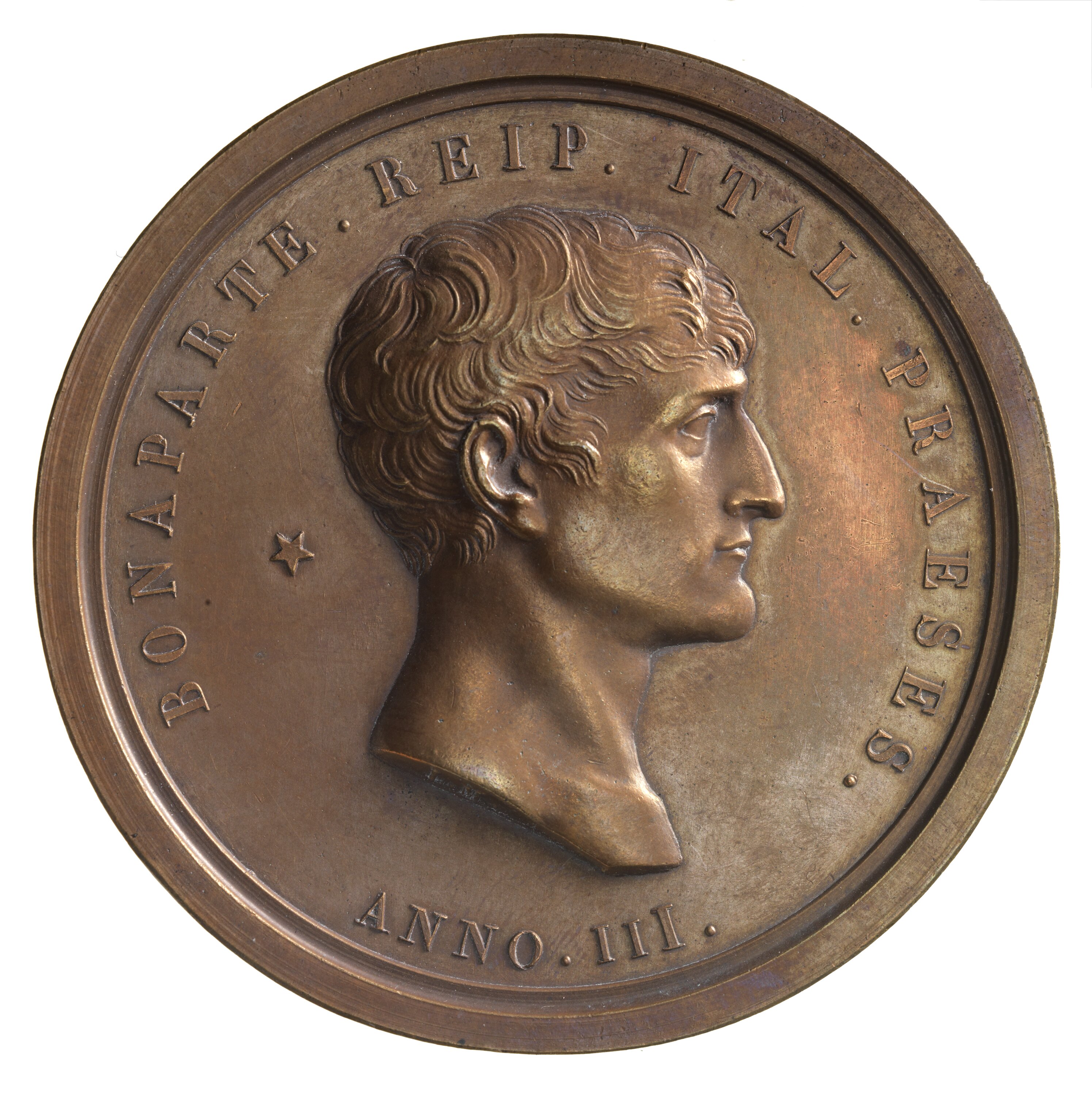 Bare head facing left; in field behind, a star; around, BONAPARTE . REIP . ITAL . PRAESES.; below, ANNO III; on neck truncation the artist's initials, L.M.