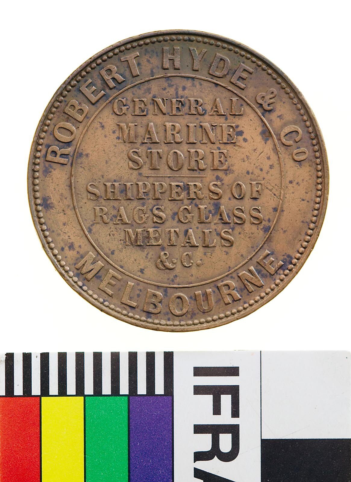 Copper one Penny Token, minted by Heaton & Sons of Birmingham, circa 1861. Issued by Robert Hyde & Co, Marine Store, Melbourne. Hyde's Marine Store was listed in a Melbourne directory for the first time in 1862. Between 1863 and 1865 he was listed as being in a partnership with Richard Hodgson (Hyde, Hodgson & Co.). In 1868 his Marine Store became a Rag Merchant's business, before becoming a Marine Store for 1869 and 1870. The firm's principal business was dealing in second hand and scrap goods.