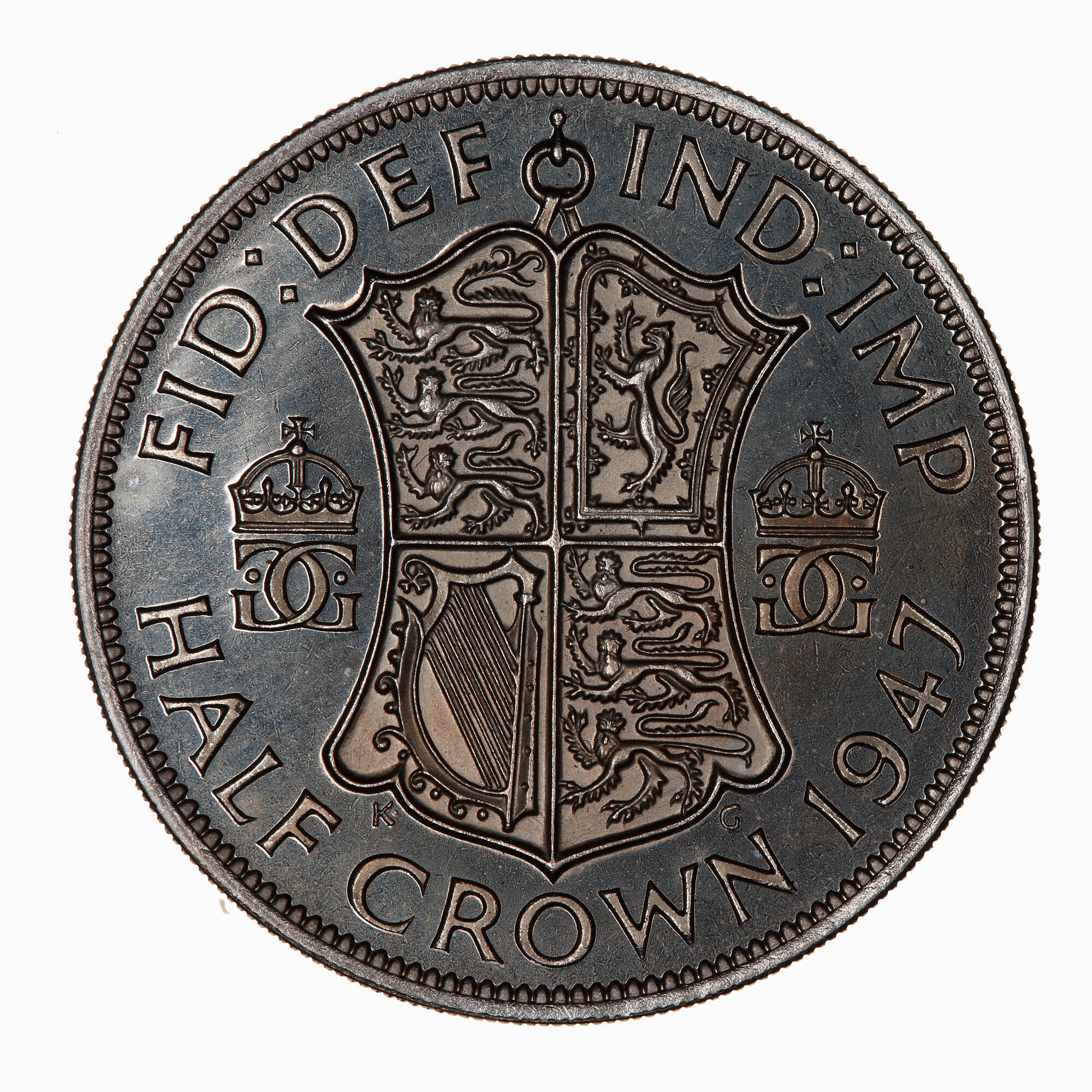 Ornately shaped shield hanging from a loop, quartered with the arms of England (1 & 4), Scotland (2) and Ireland (3) dividing two crowned GG (one reversed); below shield in small letters, K. G (G. Kruger Gray); around above, FID: DEF: IND: IMP:; around below, HALF CROWN 1947
