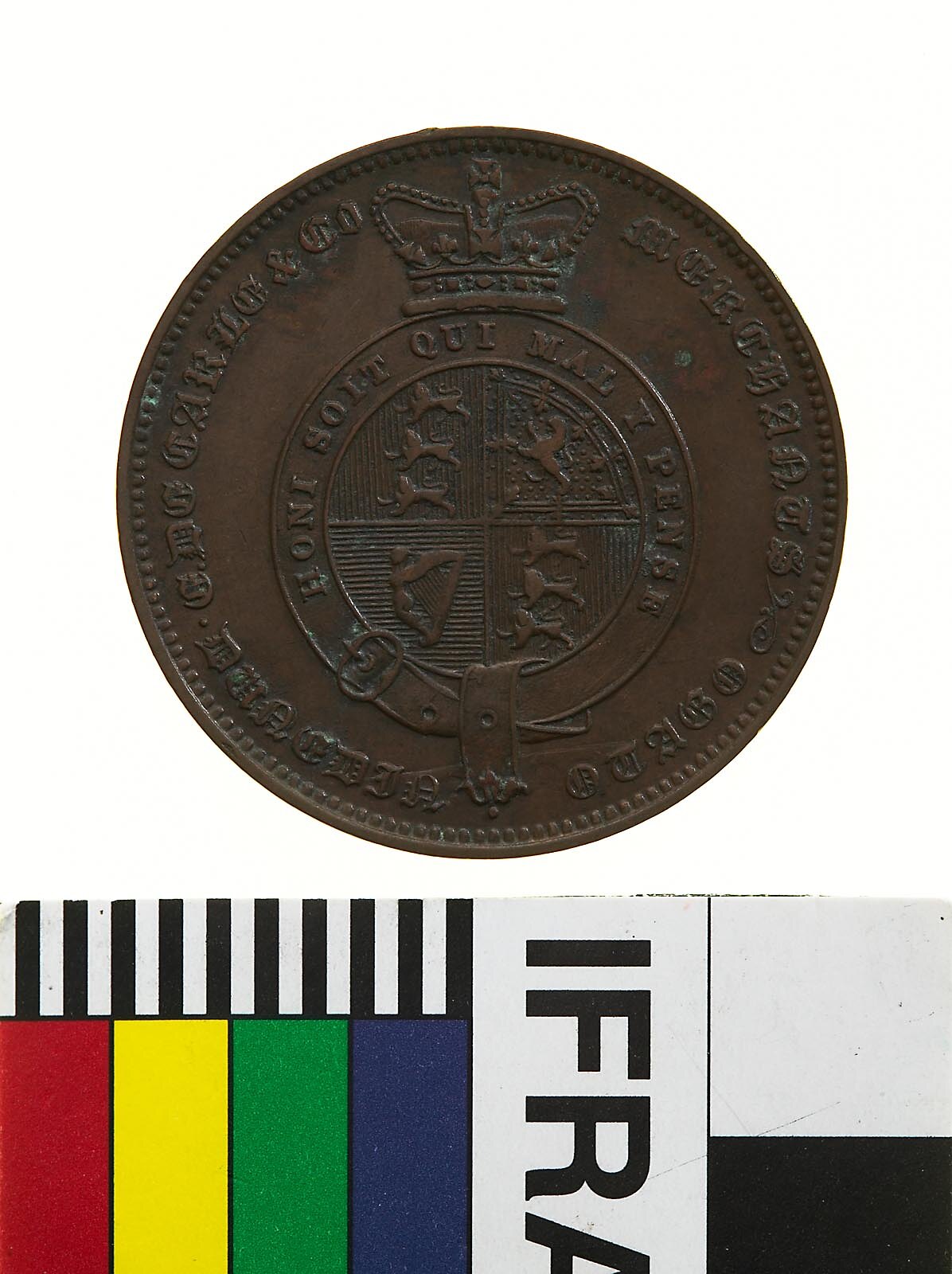 A round copper token (31 mm diameter). The token features the name, address and business of the issuer: E. DeCarle & Co., Merchants, Dunedin, Otago around the British Royal Arms. The reverse depicts a female figure representing Justice seated on a wool bale with legs to left but her head and upper body to front. A wine barrel lies on the ground behind her and a three-masted sailing ship sails away to the leftt on the horizon to the left. She wears a blindfold and extends a balanced set of scales with her right hand. With her left she holds an inverted cornucopia from which fruits flow onto the ground. She wears an ancient-style of flowing dress bound at the waist, her left arm bare and right draped to near the elbow.