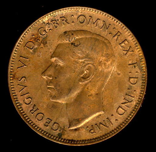 Obverse: GEORGIVS VI D: G: BR: OMN: REX F: D: IND: IMP: Reverse: AUSTRALIA 1938 PENNY KG