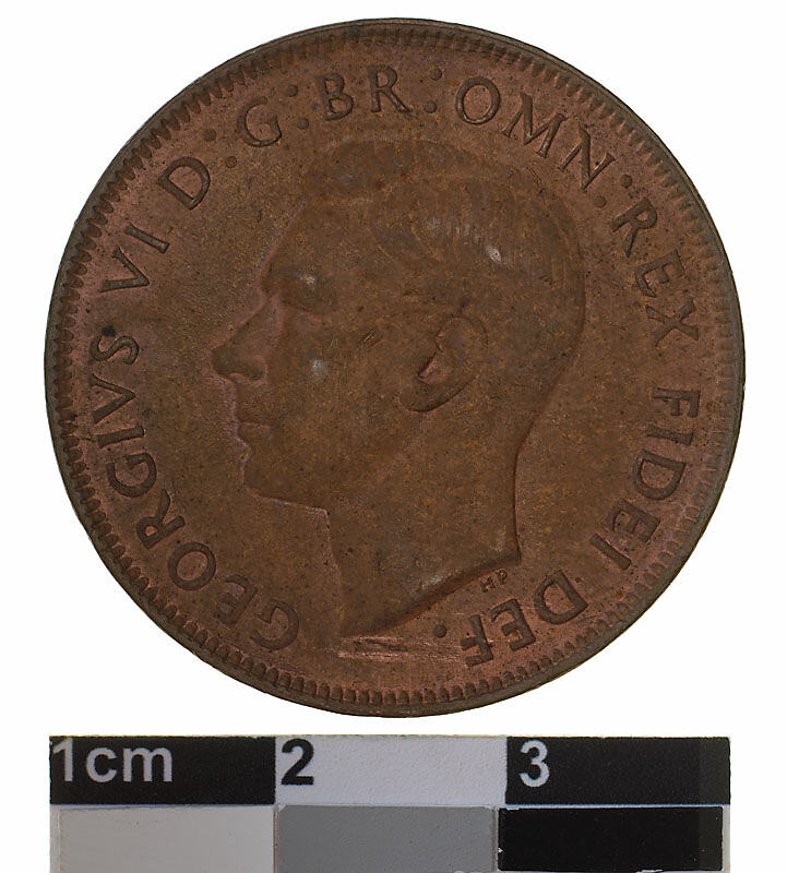 Bare head of George VI facing left; around, GEORGIVS VI D:G: BR: OMN: REX FIDEI DEF. ; below head in small lettering the artist's initials HP.