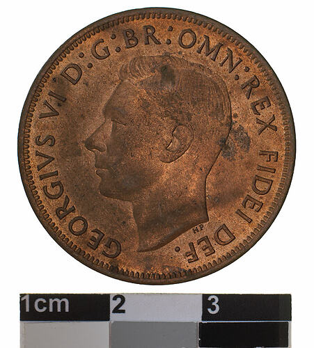 A bronze coin (30.8 mm diameter with plain edge) featuring a bare head of George VI facing left; around, GEORGIVS VI D:G: BR: OMN: REX FIDEI DEF. ; below head in small lettering the artist's initials HP. The reverse features a kangaroo leaping to the left; around above AUSTRALIA, around below, PENNY; the Federation star is in the field to the left of the kangaroo and the date, 1952 is in the field below its tail. The artist's initials KG are above the tip of the tail. The mint mark, PL is near the rim below the numerals '51' of the date.