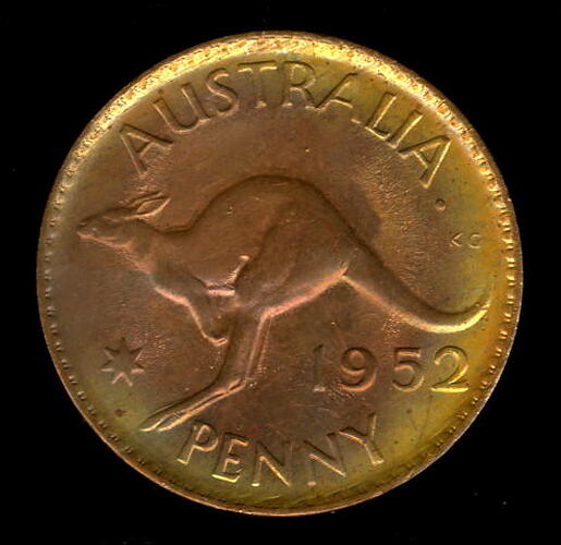 Kangaroo leaping to the left; around above AUSTRALIA., around below, PENNY; the Federation star is in the field to the left of the kangaroo and the date, 1951 is in the field below its tail. The artist's initials KG are above the tip of the tail. The tiny dot after AUSTRALIA is the Perth mint mark on this issue.