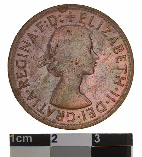 Obverse: + ELIZABETH . II . DEI . GRATIA . REGINA F: D: Reverse: AUSTRALIA PENNY. KG 1955