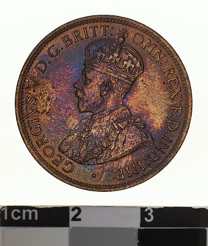 Crowned and robed bust of George V facing left; around, GEORGIVS V D. G. BRITT: OMN: REX F. D. IND: IMP: ; below bust in small lettering the artist's initials B.M.
