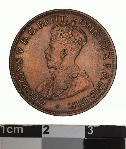 During World War I the Calcutta mint was employed from 1916 to 1918 to strike bronze penny and halfpenny coins for Australia. This is a specimen strike of the first of these products.