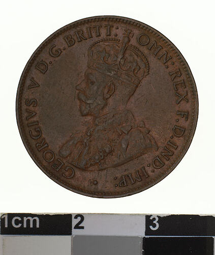 A bronze coin (25.5 mm diameter with plain edge) featuring a crowned and robed bust of George V facing left; around, GEORGIVS V D.G: BRITT: OMN: REX F.D. IND: IMP: ; below bust in small lettering the artist's initials B.M. The reverse features, within a circle of beads, the words ONE HALF PENNY in three lines above a plain scroll; around the circle of beads, COMMONWEALTH OF AUSTRALIA . 1935 .