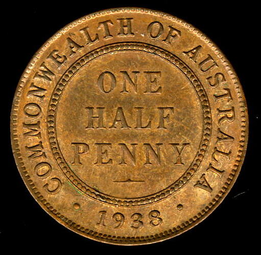 Obverse: GEORGIVS VI D: G: BR: OMN: REX F: D: IND: IMP: Reverse: ONE HALF PENNY COMMONWEALTH OF AUSTRALIA 1938