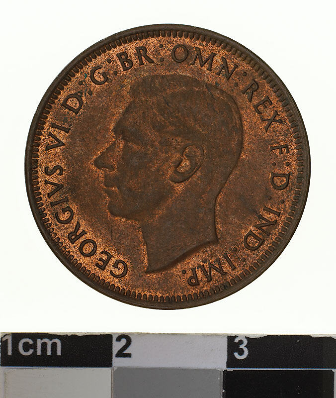 A bronze coin (25.5 mm diameter with plain edge) featuring a bare head of George VI facing left; around, GEORGIVS VI D: G: BR: OMN: REX F: D: IND: IMP: ; below the head in small lettering the artist's initials HP. The reverse features, a kangaroo leaping right; around above, AUSTRALIA; around below HALF PENNY. The date, 1940 is below the Kangaroo and the Federation star follows the word PENNY. The artist's initials, KG are below the kangaroo's tail near the rim.