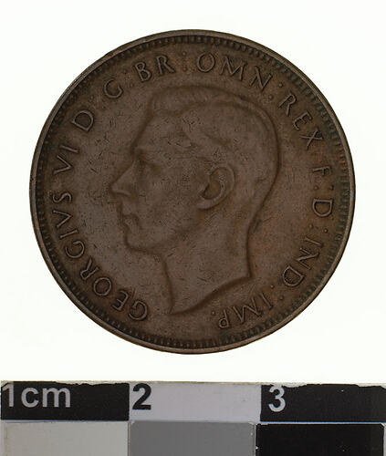A bronze coin (25.5 mm diameter with plain edge) featuring a bare head of George VI facing left; around, GEORGIVS VI D: G: BR: OMN: REX F: D: IND: IMP: ; below the head in small lettering the artist's initials HP. The reverse features, a kangaroo leaping right; around above, AUSTRALIA; around below HALF PENNY. The date, 1942 is below the Kangaroo and the Federation star follows the word PENNY. The artist's initials, KG are below the kangaroo's tail near the rim.