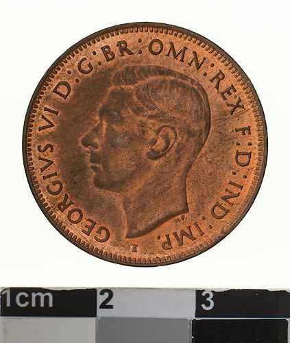 A bronze coin (25.5 mm diameter with plain edge) featuring a bare head of George VI facing left; around, GEORGIVS VI D: G: BR: OMN: REX F: D: IND: IMP: ; below the head in small lettering the artist's initials HP and the mint mark I is below the front of the neck truncation. The reverse features, a kangaroo leaping right; around above, AUSTRALIA; around below HALF PENNY (dots before and after represent the mint mark). The date, 1942 is below the Kangaroo and the Federation star follows the word PENNY. The artist's initials, KG are below the kangaroo's tail near the rim.