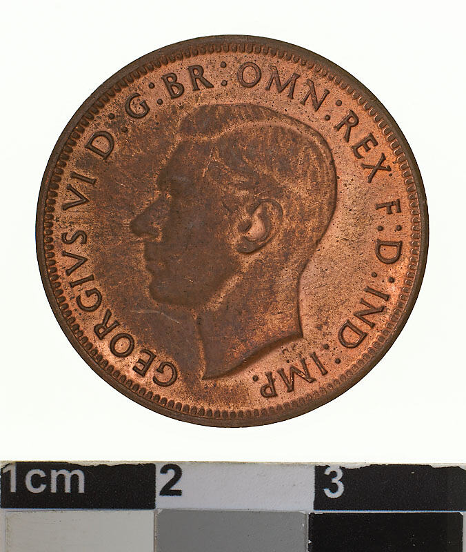 A bronze coin (25.5 mm diameter with plain edge) featuring a bare head of George VI facing left; around, GEORGIVS VI D: G: BR: OMN: REX F: D: IND: IMP: ; below the head in small lettering the artist's initials HP. The reverse features, a kangaroo leaping right; around above, AUSTRALIA; around below HALF PENNY. The date, 1943 is below the Kangaroo and the Federation star follows the word PENNY. The artist's initials, KG are below the kangaroo's tail near the rim.