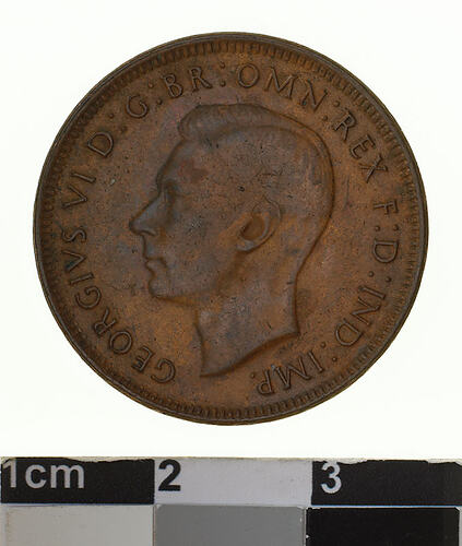 A bronze coin (25.5 mm diameter with plain edge) featuring a bare head of George VI facing left; around, GEORGIVS VI D: G: BR: OMN: REX F: D: IND: IMP: ; below the head in small lettering the artist's initials HP. The reverse features, a kangaroo leaping right; around above, AUSTRALIA; around below HALF PENNY. The date, 1944 is below the Kangaroo and the ederation star follows the word PENNY. The artist's initials, KG are below the kangaroo's tail near the rim.