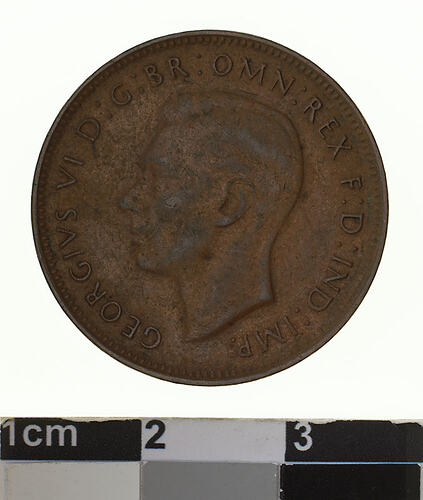 Obverse: GEORGIVS VI D: G: BR: OMN: REX F: D: IND: IMP: Reverse: AUSTRALIA HALF PENNY 1948 KG