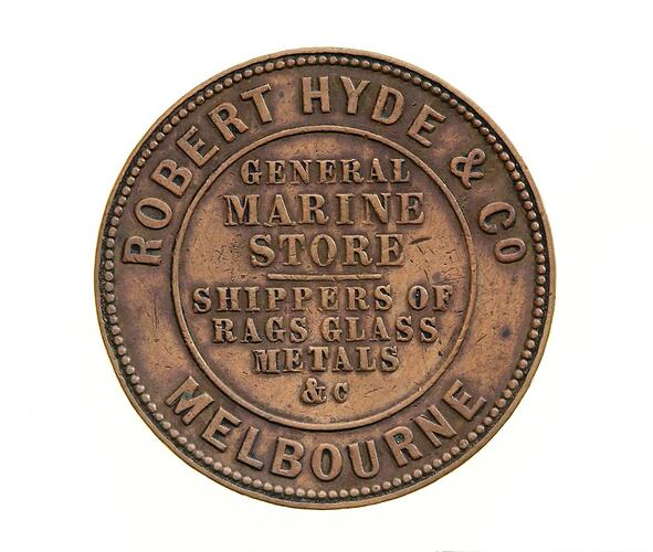 Copper Halfpenny Token, minted by Heaton & Sons of Birmingham, circa 1857. Issued by Robert Hyde & Co, Marine Store, Melbourne. Hyde's Marine Store was listed in a Melbourne directory for the first time in 1862. Between 1863 and 1865 he was listed as being in a partnership with Richard Hodgson (Hyde, Hodgson & Co.). In 1868 his Marine Store became a Rag Merchant's business, before becoming a Marine Store for 1869 and 1870. The firm's principal business was dealing in second hand and scrap goods.