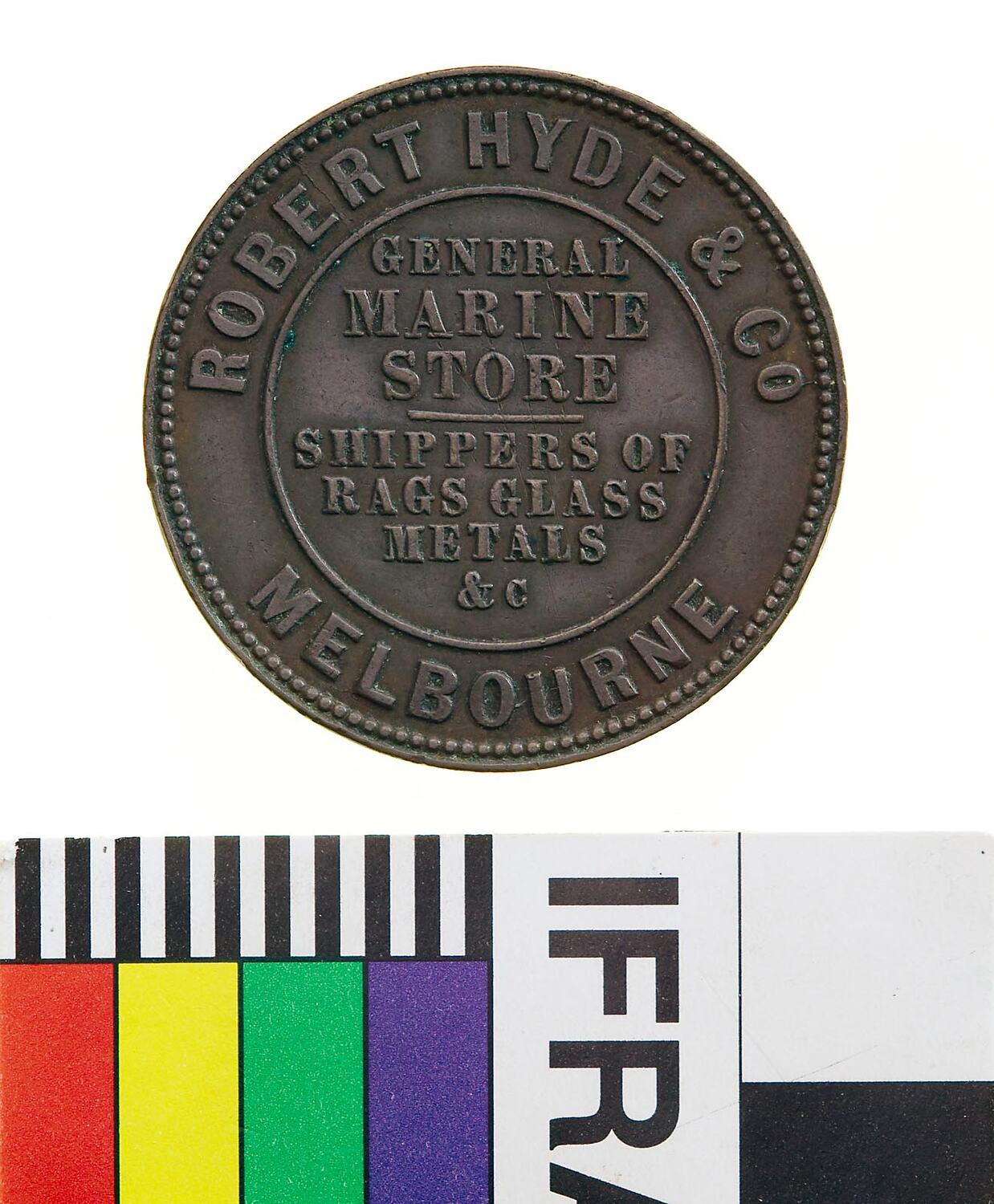 Copper Halfpenny Token, minted by Heaton & Sons of Birmingham, circa 1861. Issued by Robert Hyde & Co, Marine Store, Melbourne. Hyde's Marine Store was listed in a Melbourne directory for the first time in 1862. Between 1863 and 1865 he was listed as being in a partnership with Richard Hodgson (Hyde, Hodgson & Co.). In 1868 his Marine Store became a Rag Merchant's business, before becoming a Marine Store for 1869 and 1870. The firm's principal business was dealing in second hand and scrap goods.