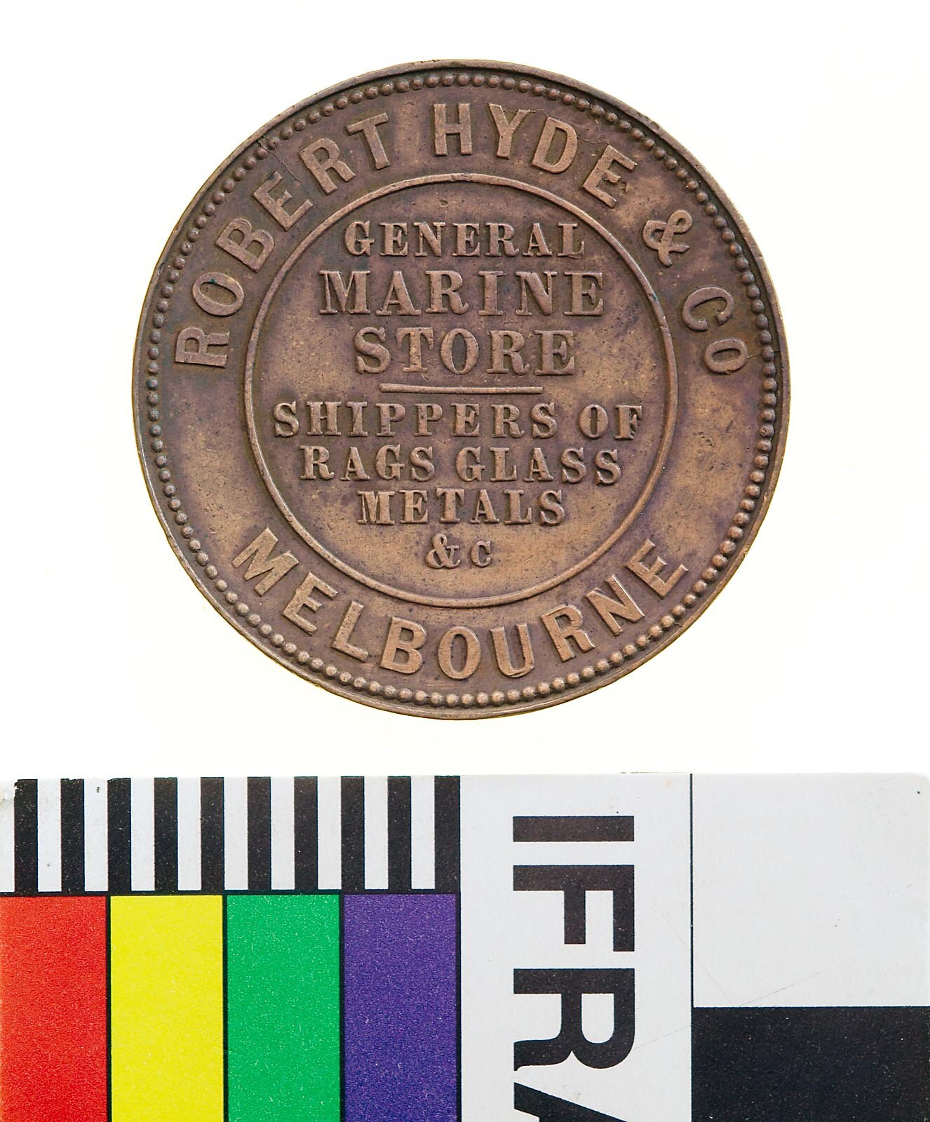 Copper Halfpenny Token, minted by Heaton & Sons of Birmingham, circa 1861. Issued by Robert Hyde & Co, Marine Store, Melbourne. Hyde's Marine Store was listed in a Melbourne directory for the first time in 1862. Between 1863 and 1865 he was listed as being in a partnership with Richard Hodgson (Hyde, Hodgson & Co.). In 1868 his Marine Store became a Rag Merchant's business, before becoming a Marine Store for 1869 and 1870. The firm's principal business was dealing in second hand and scrap goods.
