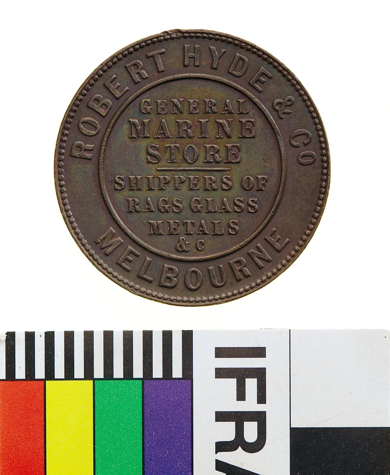 Copper Halfpenny Token, minted by Heaton & Sons of Birmingham, circa 1861. Issued by Robert Hyde & Co, Marine Store, Melbourne. Hyde's Marine Store was listed in a Melbourne directory for the first time in 1862. Between 1863 and 1865 he was listed as being in a partnership with Richard Hodgson (Hyde, Hodgson & Co.). In 1868 his Marine Store became a Rag Merchant's business, before becoming a Marine Store for 1869 and 1870. The firm's principal business was dealing in second hand and scrap goods.