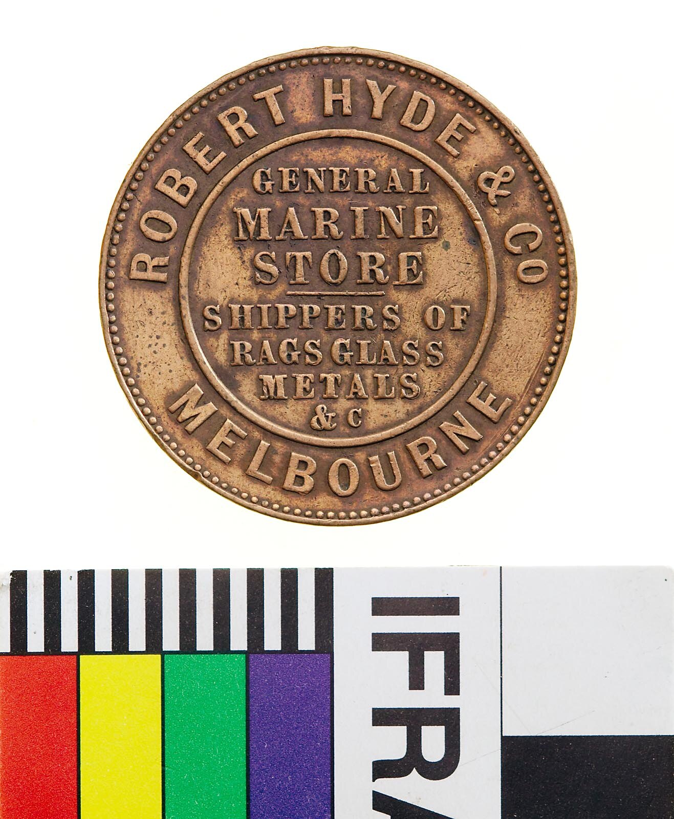 Copper Halfpenny Token, minted by Heaton & Sons of Birmingham, circa 1861. Issued by Robert Hyde & Co, Marine Store, Melbourne. Hyde's Marine Store was listed in a Melbourne directory for the first time in 1862. Between 1863 and 1865 he was listed as being in a partnership with Richard Hodgson (Hyde, Hodgson & Co.). In 1868 his Marine Store became a Rag Merchant's business, before becoming a Marine Store for 1869 and 1870. The firm's principal business was dealing in second hand and scrap goods.