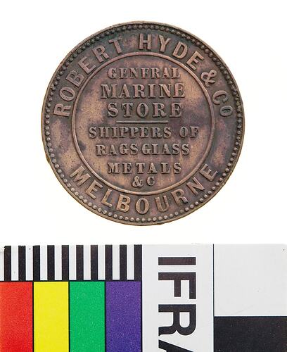 Copper Halfpenny Token, minted by Heaton & Sons of Birmingham, circa 1861. Issued by Robert Hyde & Co, Marine Store, Melbourne. Hyde's Marine Store was listed in a Melbourne directory for the first time in 1862. Between 1863 and 1865 he was listed as being in a partnership with Richard Hodgson (Hyde, Hodgson & Co.). In 1868 his Marine Store became a Rag Merchant's business, before becoming a Marine Store for 1869 and 1870. The firm's principal business was dealing in second hand and scrap goods.