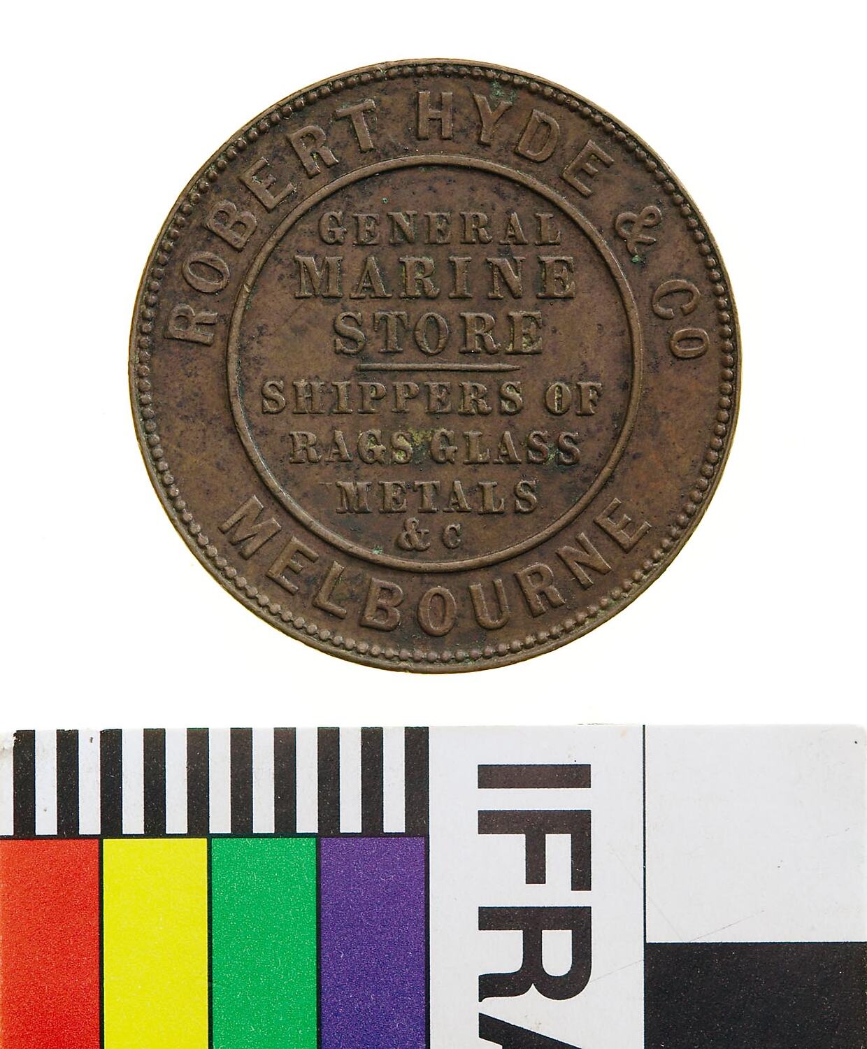 Copper Halfpenny Token, minted by Heaton & Sons of Birmingham, circa 1861. Issued by Robert Hyde & Co, Marine Store, Melbourne. Hyde's Marine Store was listed in a Melbourne directory for the first time in 1862. Between 1863 and 1865 he was listed as being in a partnership with Richard Hodgson (Hyde, Hodgson & Co.). In 1868 his Marine Store became a Rag Merchant's business, before becoming a Marine Store for 1869 and 1870. The firm's principal business was dealing in second hand and scrap goods.