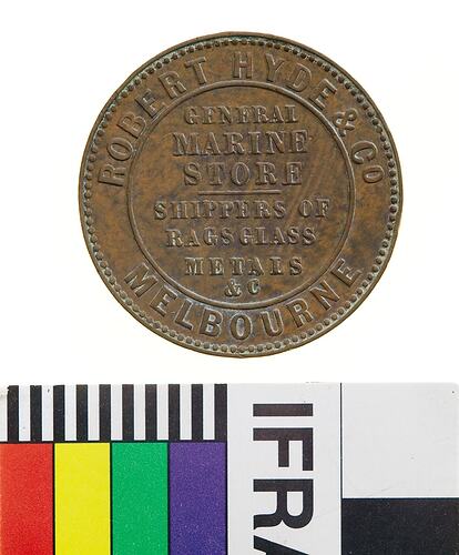 Copper Halfpenny Token, minted by Heaton & Sons of Birmingham, circa 1861. Issued by Robert Hyde & Co, Marine Store, Melbourne. Hyde's Marine Store was listed in a Melbourne directory for the first time in 1862. Between 1863 and 1865 he was listed as being in a partnership with Richard Hodgson (Hyde, Hodgson & Co.). In 1868 his Marine Store became a Rag Merchant's business, before becoming a Marine Store for 1869 and 1870. The firm's principal business was dealing in second hand and scrap goods.