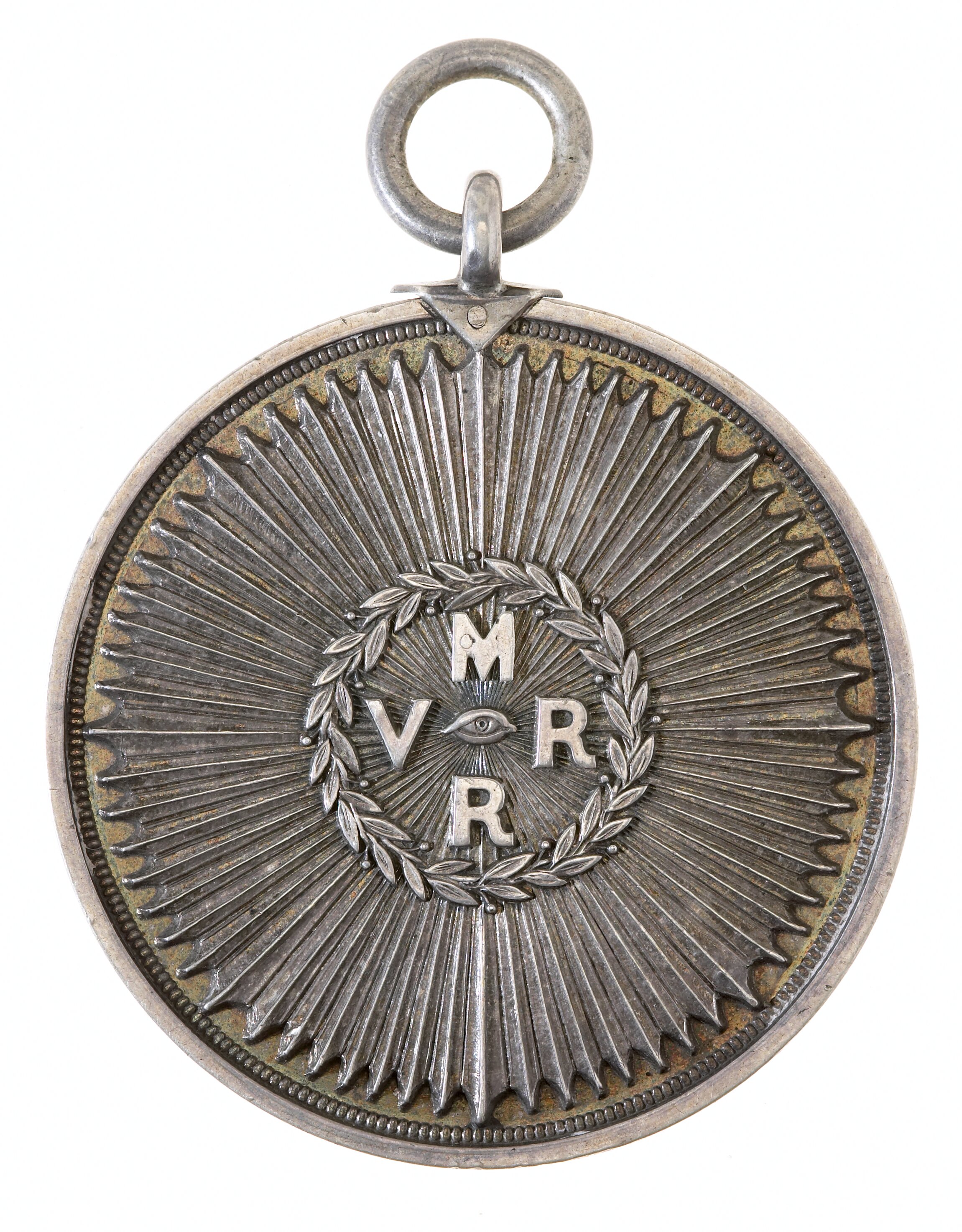 At centre the All-seeing eye radiating light beams to near rim of medal; around eye a circular wreath within which the letters VMRR.