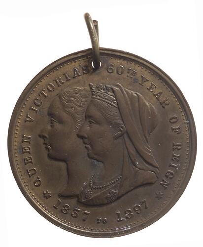 Conjoined young head and veiled bust of Queen Victoria left, around, QUEEN VICTORIA'S 60TH. YEAR OF REIGN * 1837 TO 1897 *