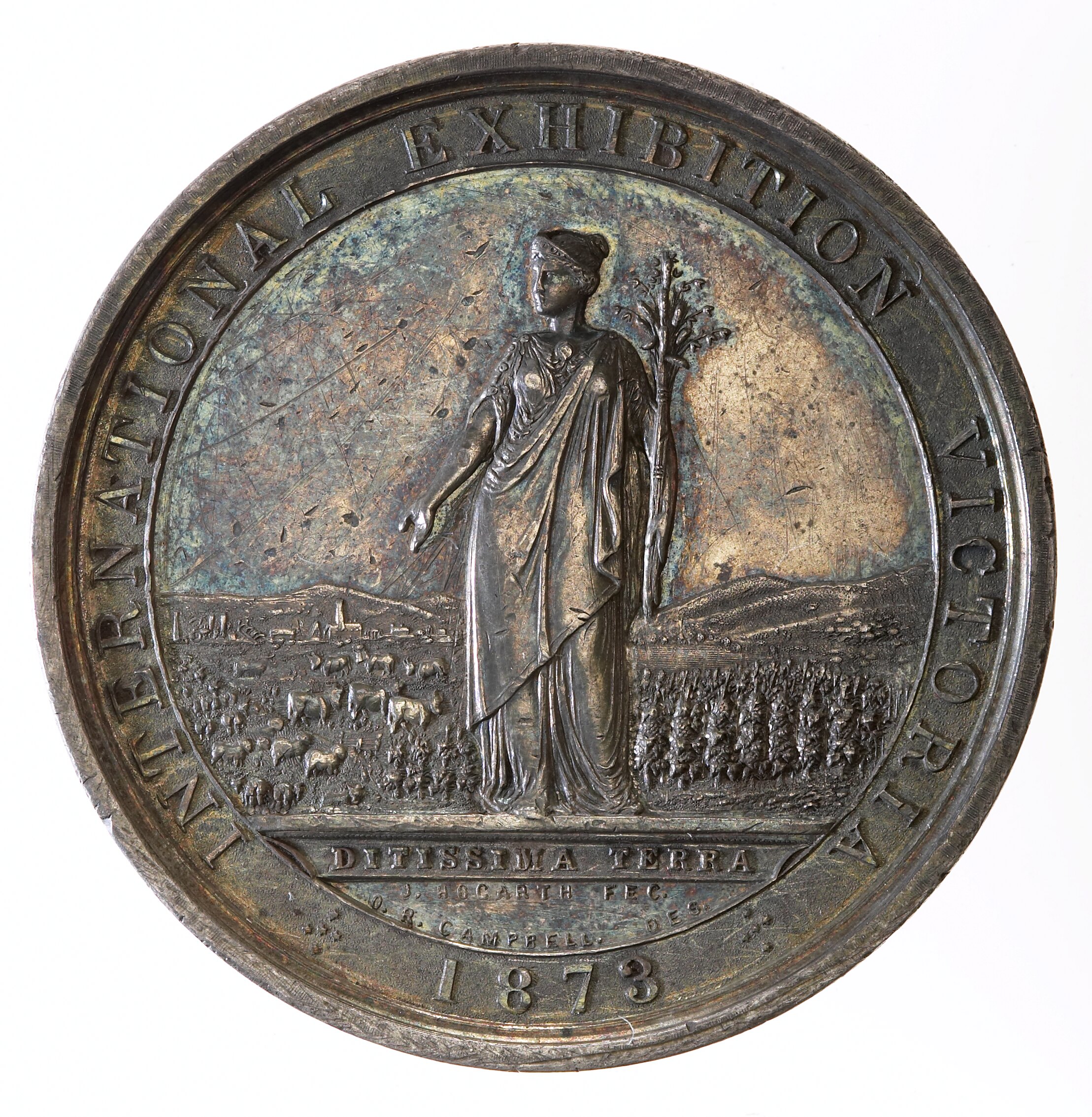 Female representing Colony of Victoria standing three quarters left before rural and industrial scene; around, INTERNATIONAL EXHIBITION VICTORIA * 1873 *; in exergue, DITISSIMA TERRA / J.HOGARTH FEC. / O.R. CAMPBELL DES.