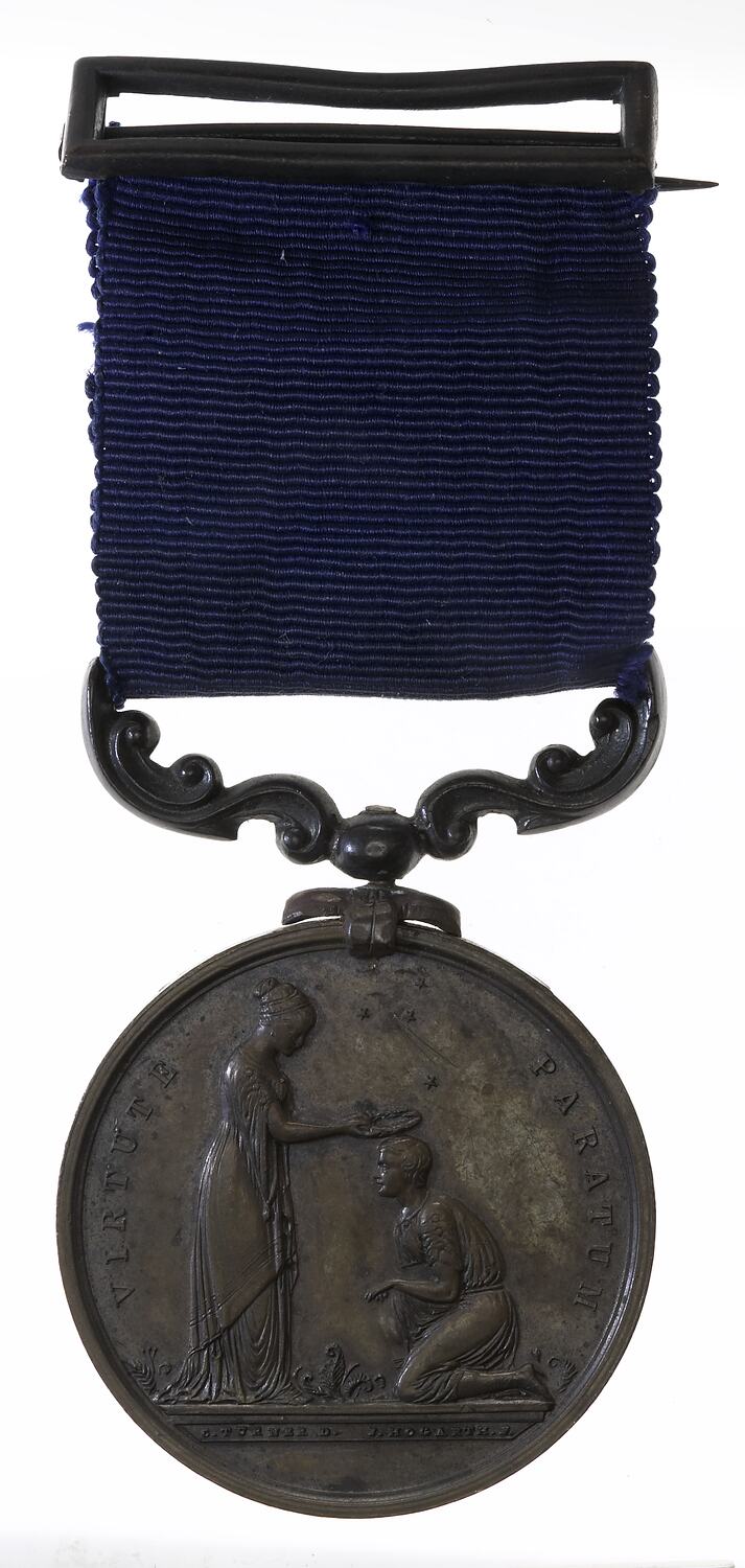 Woman in Ancient Greek clothing standing at left placing wreath on head of young man kneeling at right below Southern Cross; around, VIRTUTE PARATUM (obverse) At centre within olive wreath AWARDED / TO / Phillip Halfpenny / 1884 around, ROYAL HUMANE SOCIETY OF AUSTRALASIA INSTD. A.D. 1874 (the name of recipient and date are engraved)(reverse)