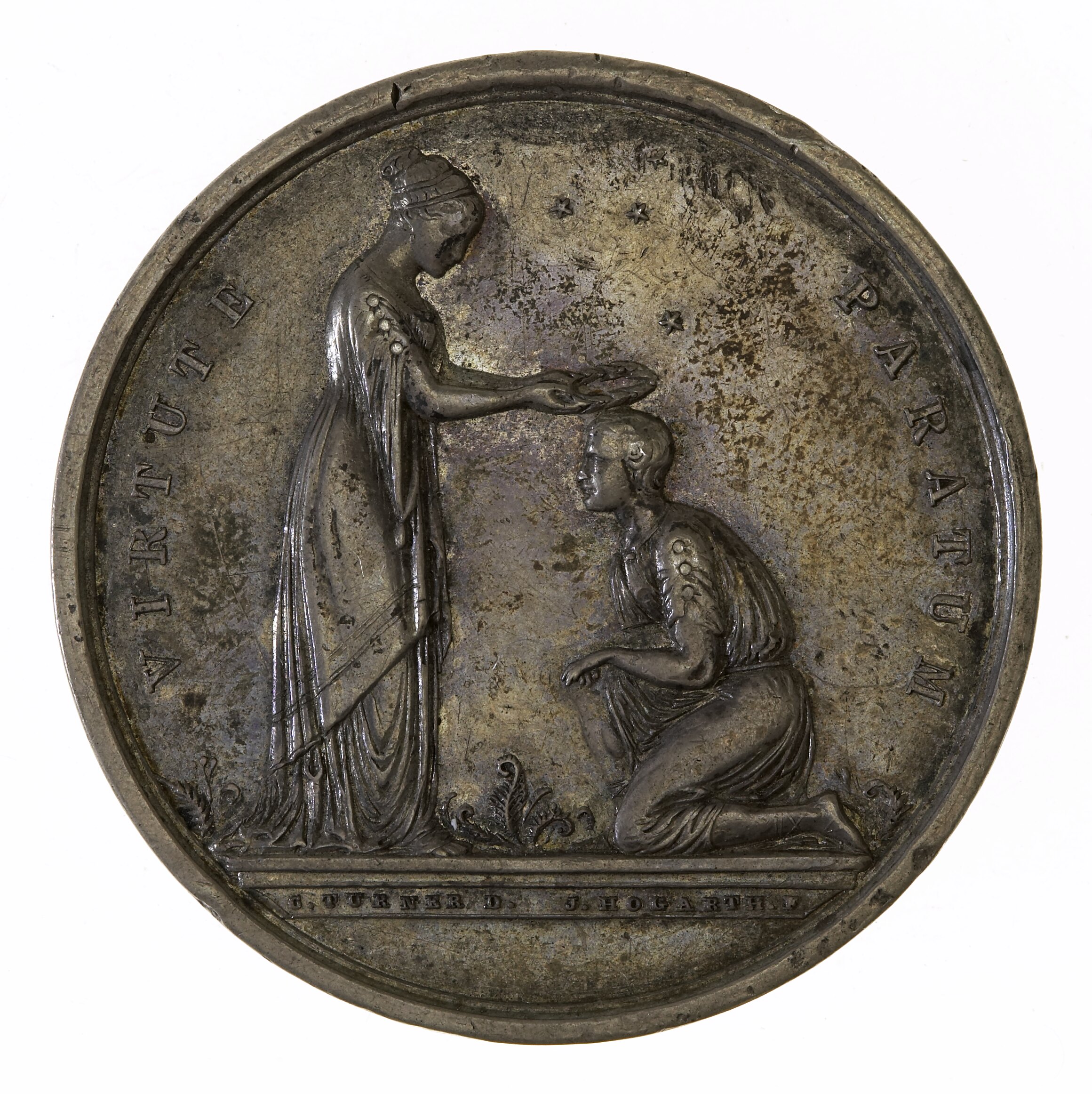 Silver medal, 39 mm diameter. The obverse features a woman in ancient Greek clothing placing a wreath on the head of a kneeling male beneath the Southern Cross. The reverse provides the name of the winner, Mary Cosgrove the date 1885 on the reverse within a wreath.