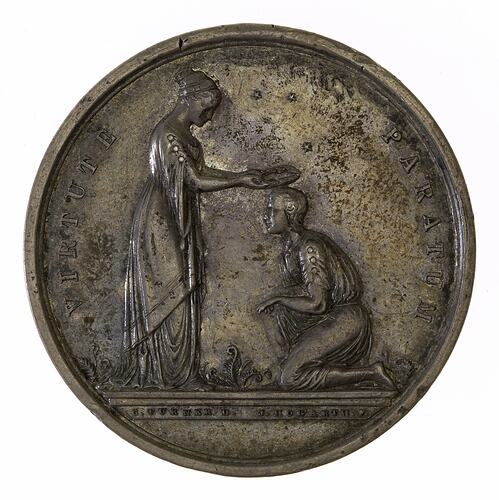 Woman in Ancient Greek clothing standing at left placing wreath on head of young man kneeling at right below Southern Cross; around, VIRTUTE PARATUM